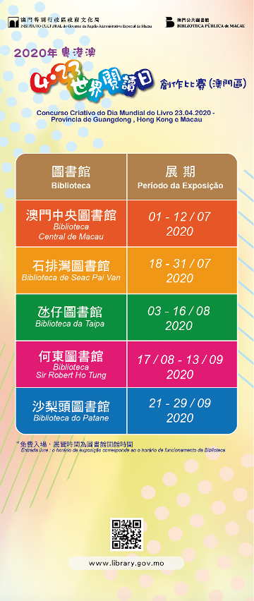 由文化局公共图书馆、香港公共图书馆、广东省立中山图书馆及深圳图书馆合作举办的2020年粤港澳“4.23世界阅读日创作比赛”(澳门区),得奬作品将于2020年7月至9月期间,于文化局辖下澳门中央图书馆、石排湾图书馆、氹仔图书馆、何东图书馆及沙梨头图书馆巡回展出。展览免费入场,欢迎市民参观,一同分享得奬者之喜悦及创作成果。