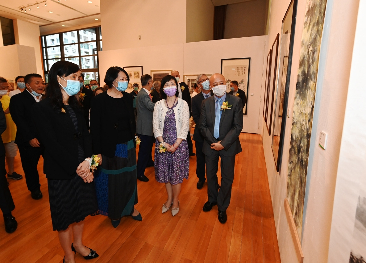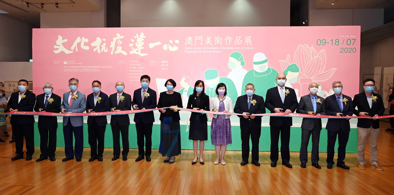 由文化局与中央人民政府驻澳门特别行政区联络办公室宣传文化部联合主办的“文化抗疫莲一心—澳门美术作品展”于7月8日(星期三)下午6时30分在澳门回归贺礼陈列馆举行揭幕仪式。仪式由澳门特别行政区政府社会文化司司长欧阳瑜、中央人民政府驻澳门特别行政区联络办公室副主任严植婵、澳门特别行政区政府文化局局长穆欣欣、中央人民政府驻澳门特别行政区联络办公室宣传文化部部长万速成、澳门颐园书画会会长崔世昌、澳门日报社长陆波、澳门广播电视股份有限公司执行委员会主席白文浩、澳门美术家协会主席黎鹰、澳门美术协会会长陆曦、澳门智慧人文励政会会长吴在权、澳门书法篆刻协会会长萧春源、松风文化艺术协会会长苏鉴良、澳门水墨艺术学会会长麦理、美术纵横社长刘富业主礼。