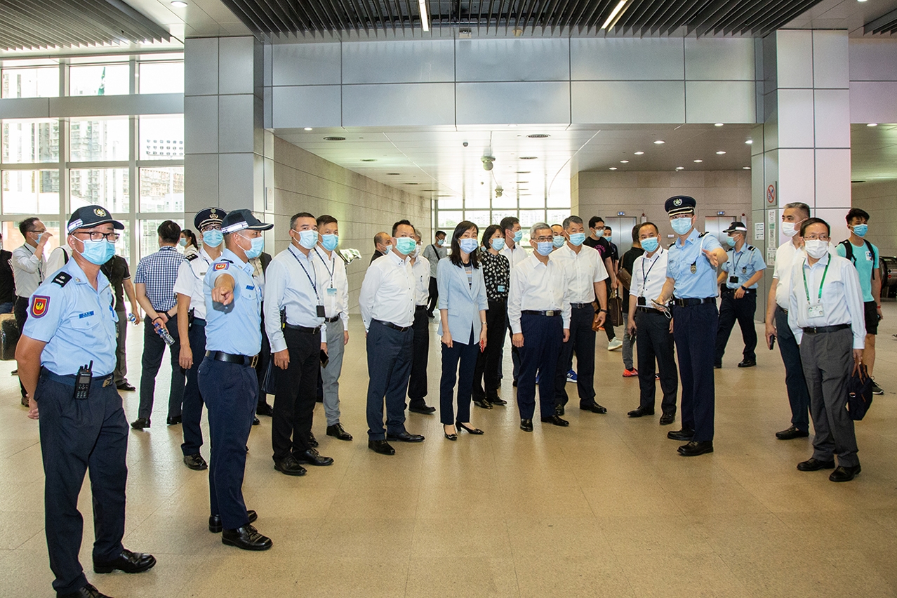 两司长及一行官员首先视察了关闸广场离境人流的管理措施,并瞭解通关人士转换健康码及离境大堂检查健康码的分流情况,以及就市民和外地雇员转码后的通关便利,提出了优化建议。