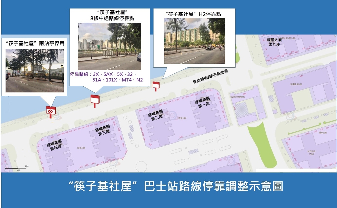 为理顺巴士站运作、优化筷子基北湾及俾若翰街周边道路的交通环境,7月25日(周六)上午首班车起调整“筷子基社屋”巴士站路线停靠安排,原站8条中途停靠路线改停绿杨花园第三座对面的站亭,H2路线则调整至绿杨花园第二座对面的位置停靠,调整后原来的两个站亭暂停使用,并于其后配合周边道路整治工程一并进行迁移。