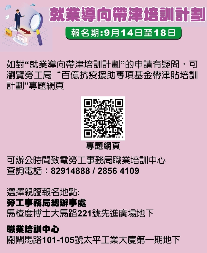 如对“就业导向带津培训计划”有疑问,可浏览百亿抗疫援助专项基金带津贴培训计划”专题网页( https://www.dsal.gov.mo/zh_tw/standard/dfptraining_employment.html )或于办公时间内致电劳工事务局职业培训中心查询,电话:82914888 / 28564109 。巿民也可选择亲临劳工事务局马揸度博士大马路221号先进广场办事处地下或关闸马路101-105号太平工业大厦第一期地下、或关闸马路101-105号太平工业大厦第一期一楼工联职业技能培训中心,由职员协助进行报名。