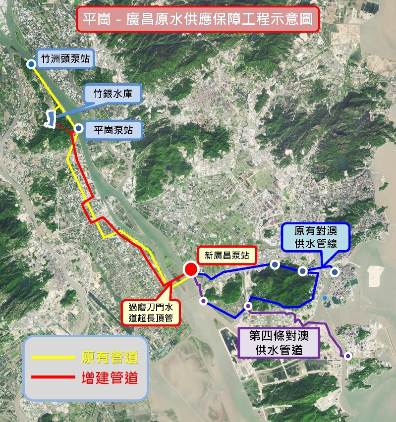 全长约22公里的平岗-广昌原水供应保障工程,是第四条对澳供水管道工程的上游工程,也是《粤澳合作框架协定》的重点专案,工程主要管段连接日常供澳原水取水口的广昌泵站和较上游的平岗泵站,新管道与2006年完成的第一期原水保障工程的管道互为备用,将在今冬明春枯水期,咸潮期间发挥重要的供水安全保障作用,也大幅加强珠海对澳供水的稳定性和抗风险能力。