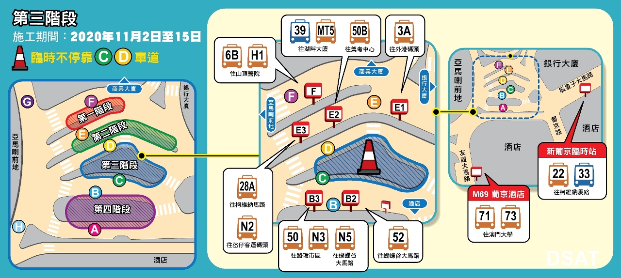 亚马喇巴士站增建雨篷第三阶段工程将于11月2日(周一)起展开,届时将围封C及D车道,原停靠该两车道共16条巴士路线将改停靠B、E、F车道、周边的“葡京酒店"站或新葡京临时站(详见附表)。巴士公司会加派工作人员在场维持秩序和指引乘客候车,乘客应留意并配合现场指示。