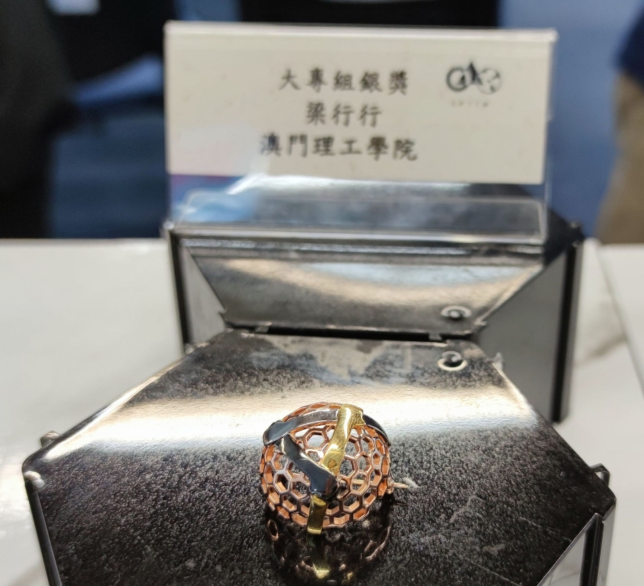 吴圆书的金奖作品运用了机械蝴蝶、齿轮、几何和花瓣等元素,展翅的蝴蝶停留在齿轮花瓣之间,与另一边的花形胸针互相呼应,展现蒸汽朋克的工业时代感觉,设计风格时尚。她认为,澳门理工学院跨领域艺术硕士学位课程的课程设置精巧,有助其结合自身的产品设计知识与跨领域艺术创作构思,提升整体设计效果。