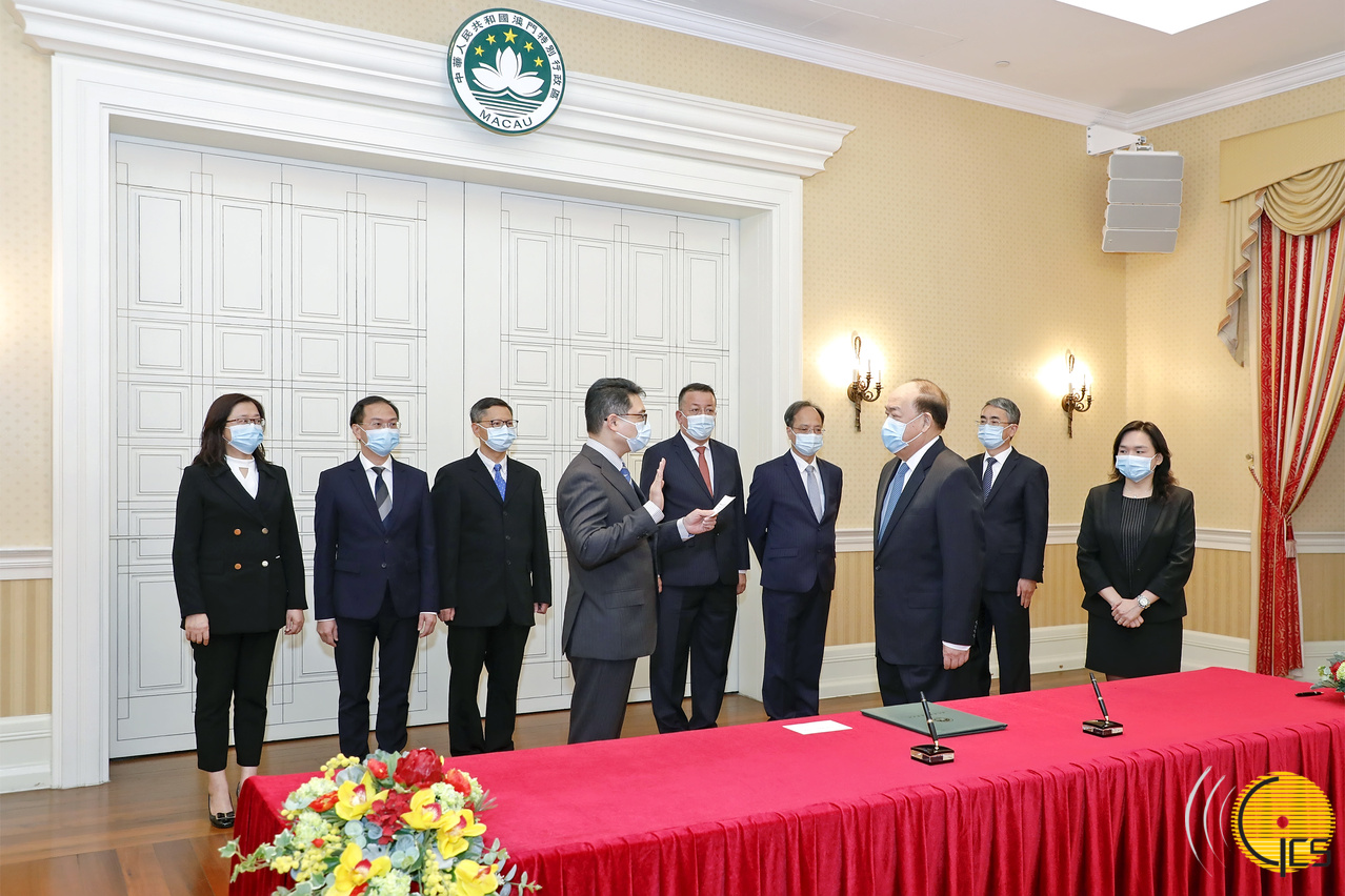 立法会选举管理委员会主席唐晓峰,委员黎裕豪、戴祖义、高炳坤、容光亮、陈露,下午在政府总部向行政长官贺一诚宣誓就职。