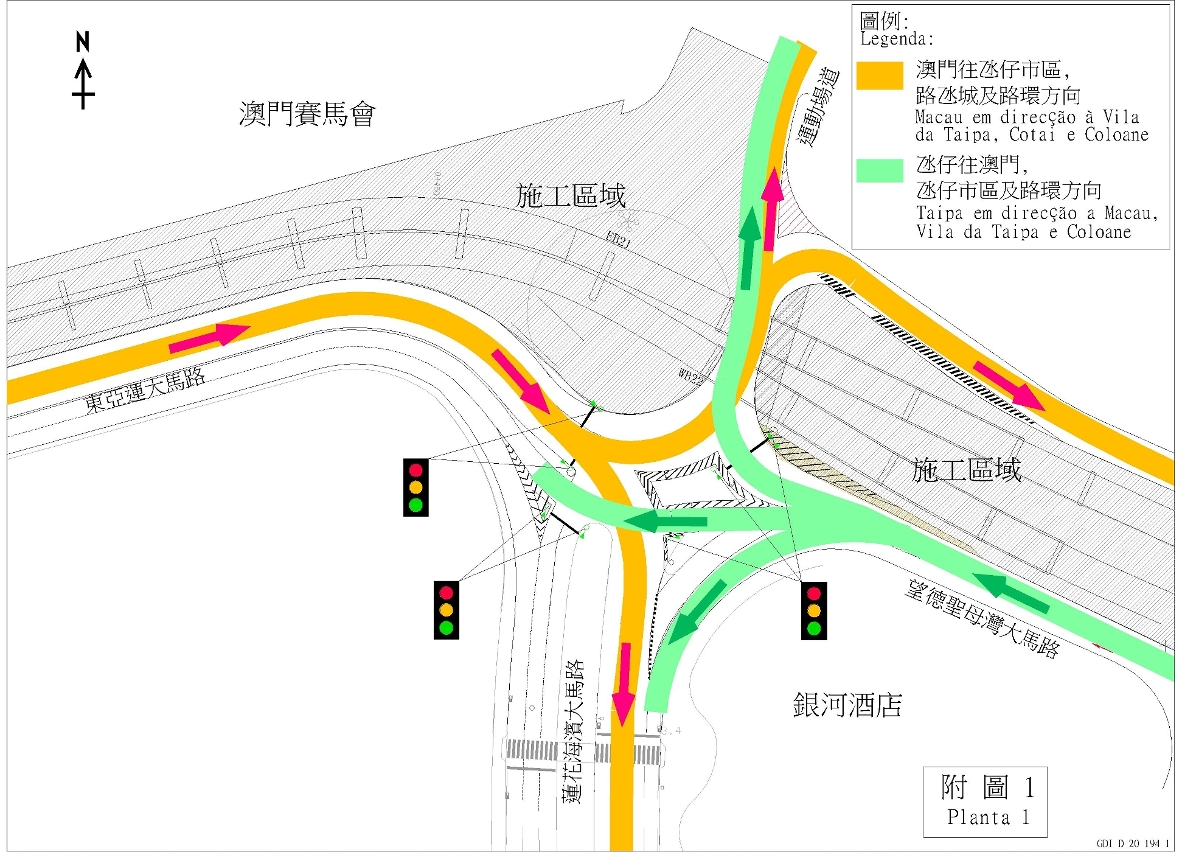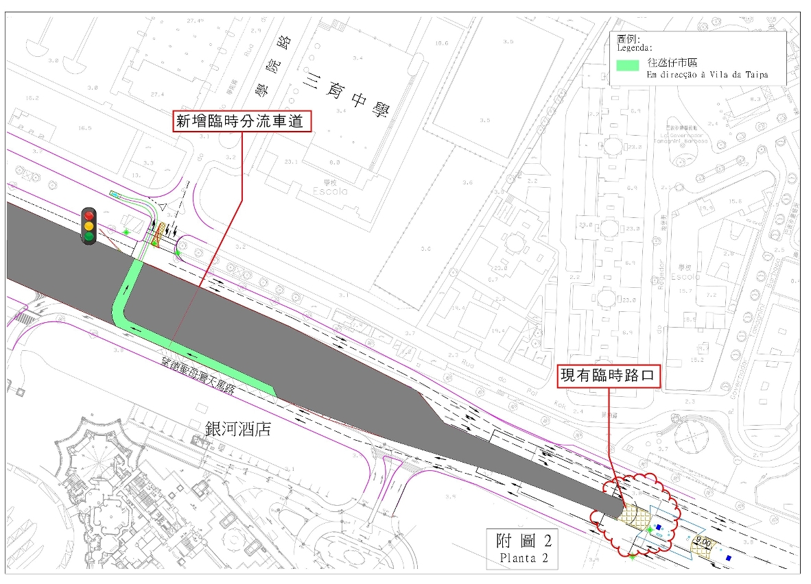 另外,沿望德圣母湾大马路前往氹仔市区的车辆可透过新设临时车道右转驶入排角路后转入运动场道(附图二)而不需进入奥林匹克游泳馆圆形地,以减低工程期间奥林匹克游泳馆圆形地的行车压力。
