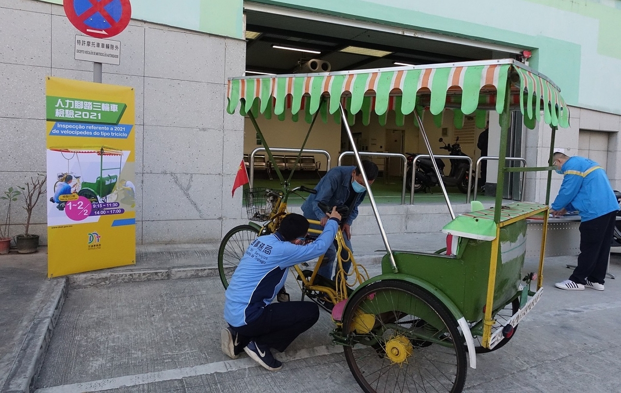 为保障人力脚踏三轮车在公共道路上行驶的安全性,交通事务局每年均为私人经营的人力脚踏三轮车(下简称:三轮车)进行检验。局方早前经与澳门三轮车工会协调,于今日(1日)起一连两日为三轮车进行年度检验,呼吁车主尽快把三轮车驶往劳动节大马路澳门摩托车检验中心受检,缺席检验或不合格的三轮车均不获发2021年度三轮车新登记折,直至该车辆检验合格才可继续营运。