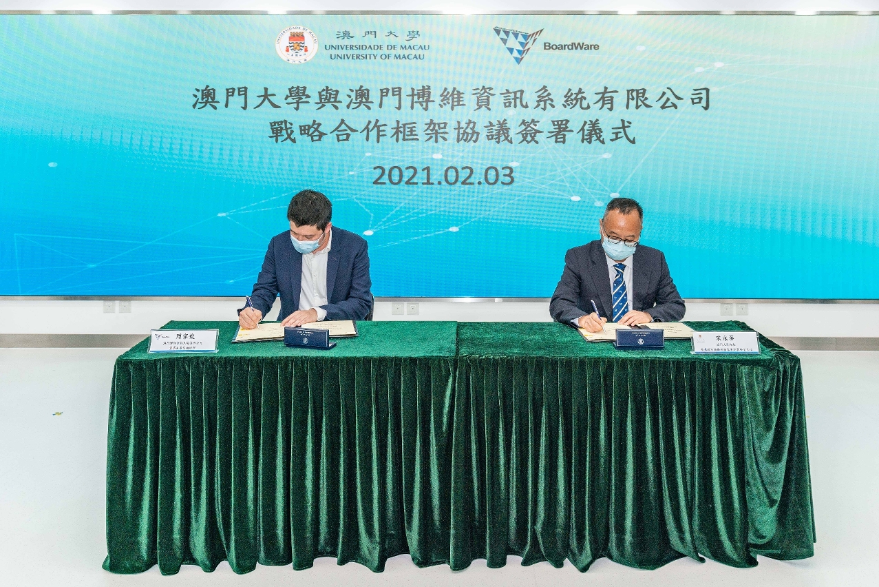 澳门大学与澳门博维信息系统有限公司(简称“澳门博维”)今(3)日于澳大智慧城市物联网国家重点实验室多功能厅签署战略合作框架协议。双方将共同建设澳门大学—澳门博维联合实验室,透过集成研发实力及资源优势,培养更多高端人才,为澳门创造更多科技成果。