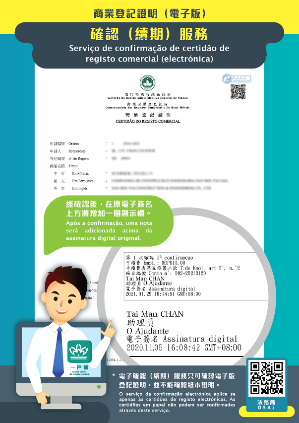为配合特区政府推行智慧政务,以及贯彻公开物业及商业登记信息,以保障受法律保护交易安全的目的,法务局-物业登记局、商业及动产登记局推出物业登记证明(电子版)及商业登记证明(电子版)的电子确认(续期)服务。