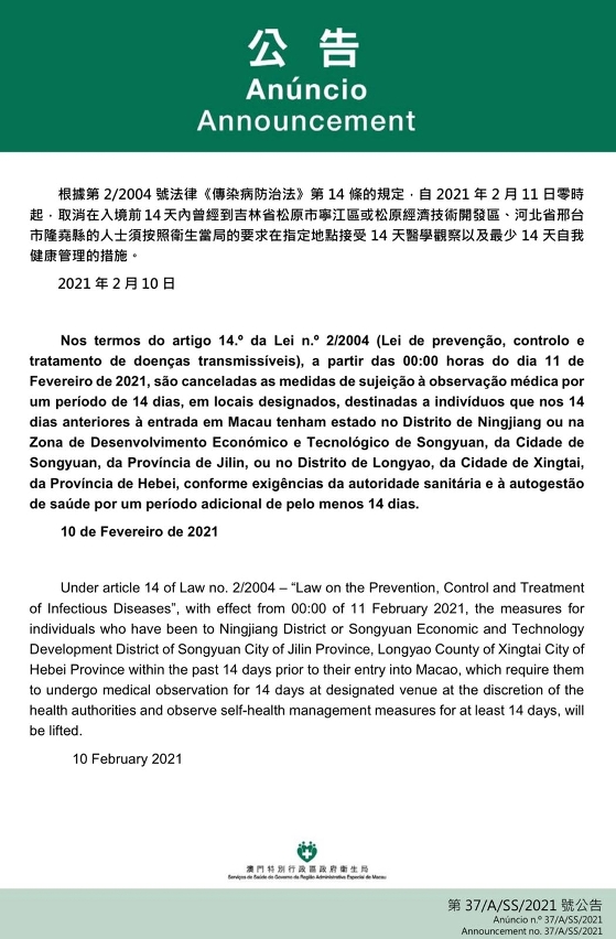 新型冠状病毒感染应变协调中心宣布,因应吉林省及河北省的疫情变化,根据第2/2004号法律《传染病防治法》第14条的规定,自2021年2月11日零时起,取消在入境前14天内曾经到过吉林省松原市宁江区或松原经济技术开发区、河北省邢台市隆尧县的人士须按照卫生当局的要求在指定地点接受14天医学观察以及最少14天自我健康管理的措施。