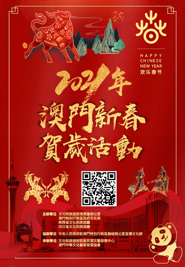 是次“2021年澳门新春贺岁活动”由文化和旅游部港澳台办公室、澳门特别行政区政府文化局、陕西省文化和旅游厅及四川省文化和旅游厅主办,中央人民政府驻澳门特别行政区联络办公室宣传文化部协办,文化和旅游部民族民间文艺发展中心及澳门中华文化艺术发展协会承办。文化和旅游部港澳台办公室党委书记、一级巡视员满宏卫,澳门特别行政区政府文化局局长穆欣欣,文化和旅游部民族民间文艺发展中心主任兰静,四川省文化和旅游厅党组成员、副厅长严飒爽,陕西省文化和旅游厅党组成员、副厅长陈梦榆分别送上贺辞。