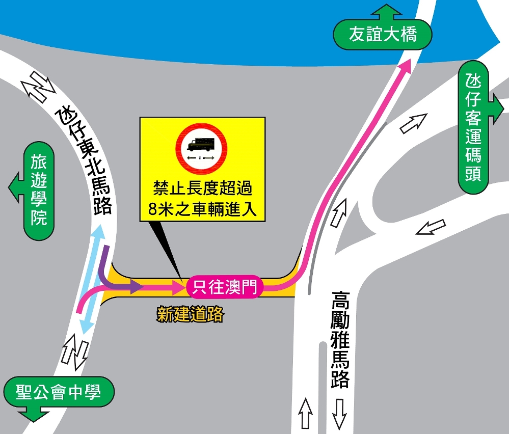 位于氹仔东北马路往高励雅马路新辟的一条单向道路将于3月3日上午10时开通,新建道路全长约140米,只通往友谊大桥往澳门,且考虑到安全原因,仅供长度不超过8米之车辆通行,呼吁驾驶者留意。同时,由于新辟道路为单向通往澳门,故当悬挂八号或以上热带气旋信号时,该道路将在警方安排下实施封闭交通。