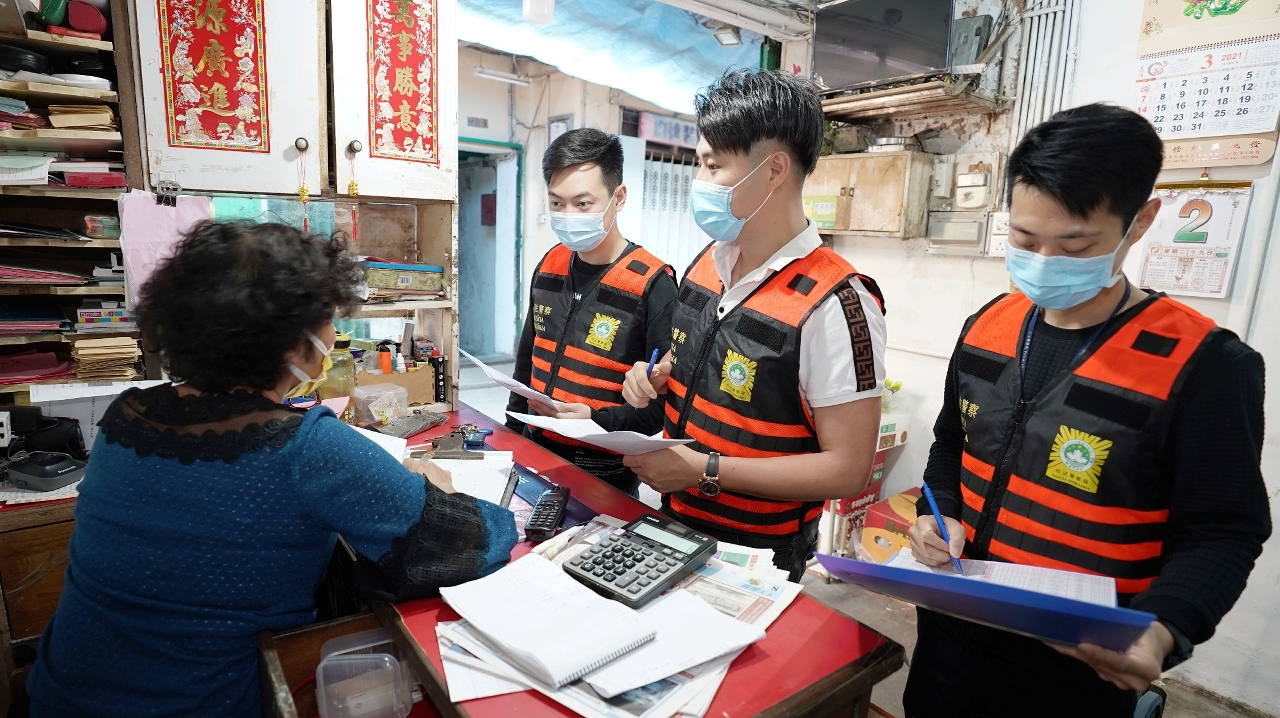 随后,司警局撤离小队人员分别前往局方负责撤离区域(即C区,包括十六浦延伸至安仿西街,再向东移至新口岸区一带)进行全面排查工作,期间除了收集并更新区内需撤离的住户和商户,以及需扶助人士等数据资料外,亦向居民和商户宣讲最新民防信息,提醒他们日常应密切留意当局发放的民防信息,做好应对台风准备工作。