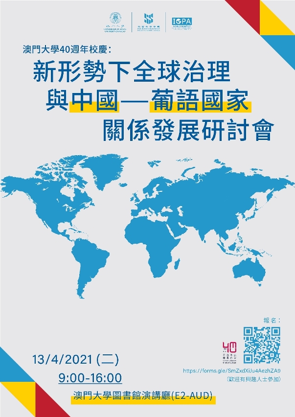 澳门大学将于4月13日(星期二)举行“新形势下全球治理与中国—葡语国家关系发展” 研讨会。届时将有澳门及内地知名专家学者参加,共同探讨新形势下的全球治理、中国道路、中国—葡语国家关系等议题。欢迎有兴趣人士参加。