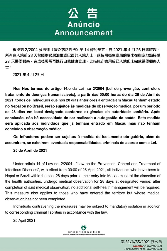 新型冠状病毒感染应变协调中心宣布,因应以下地区的疫情变化,根据第2/2004号法律《传染病防治法》第14条的规定,自2021年4月26日零时起,所有在入境前28天曾经到过尼泊尔或巴西的入境人士,须按照卫生当局的要求在指定地点接受28天医学观察,完成后毋需再进行自我健康管理。此措施亦适用于已入境但未完成医学观察人士。违反者除可能依法承担相应的刑事责任外,尚可被采取强制隔离的措施。
