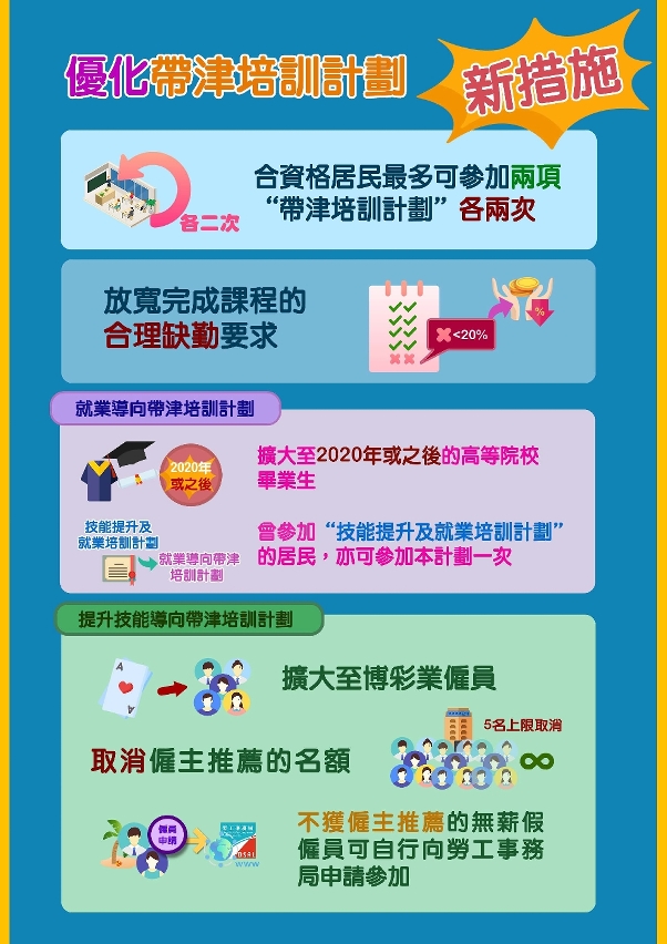 在新修订行政法规下,“提升技能导向带津培训计划”的就读对象扩展至博彩业雇员,对处于无薪假状况且不获雇主推荐报读课程人士,可自行申请报读,并取消雇主推荐雇员的名额限制;而“就业导向带津培训计划” 的参加条件亦扩展至2020年或之后毕业的学生。同时,符合相关计划资格的居民可分别参加“就业导向带津培训计划”及“提升技能导向带津培训计划” 各两次。法规亦放宽完成课程的要求,除因病缺勤的情况外,如出现劳工事务局接纳的合理缺勤情况,只要总缺勤时数不超过课程总时数的百分之二十,亦视为完成课程。