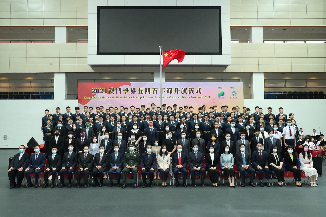 “澳门学界五四青年节升旗仪式"于今天(5月4日)早上7时45分在澳门理工学院体育馆举行。活动由镜平学校(中学部)管乐团现场奏乐开始,约90位澳门学界升旗队队员随着音乐步操向升旗台,升旗仪式在中华人民共和国国歌奏起时庄严地进行。在濠江中学、教业中学、嘉诺撒圣心英文中学、氹仔中葡学校和何东中葡小学5所学校合唱团的带领下,场内约700名参加者共同高唱国歌,整个场馆响彻嘹亮的歌声,洋溢高涨的爱国之情。升旗仪式邀请到社会文化司司长欧阳瑜、中央人民政府驻澳门特别行政区联络办公室副主任罗永纲、中华人民共和国外交部驻澳门特别行政区特派员公署特派员刘显法、中国人民解放军驻澳门部队参谋长赵建明、教青局局长老柏生、高等教育委员会代表、非高等教育委员会委员、青年事务委员会委员、教学人员专业委员会委员、高等院校领导、学校校长及青年社团代表等出席。