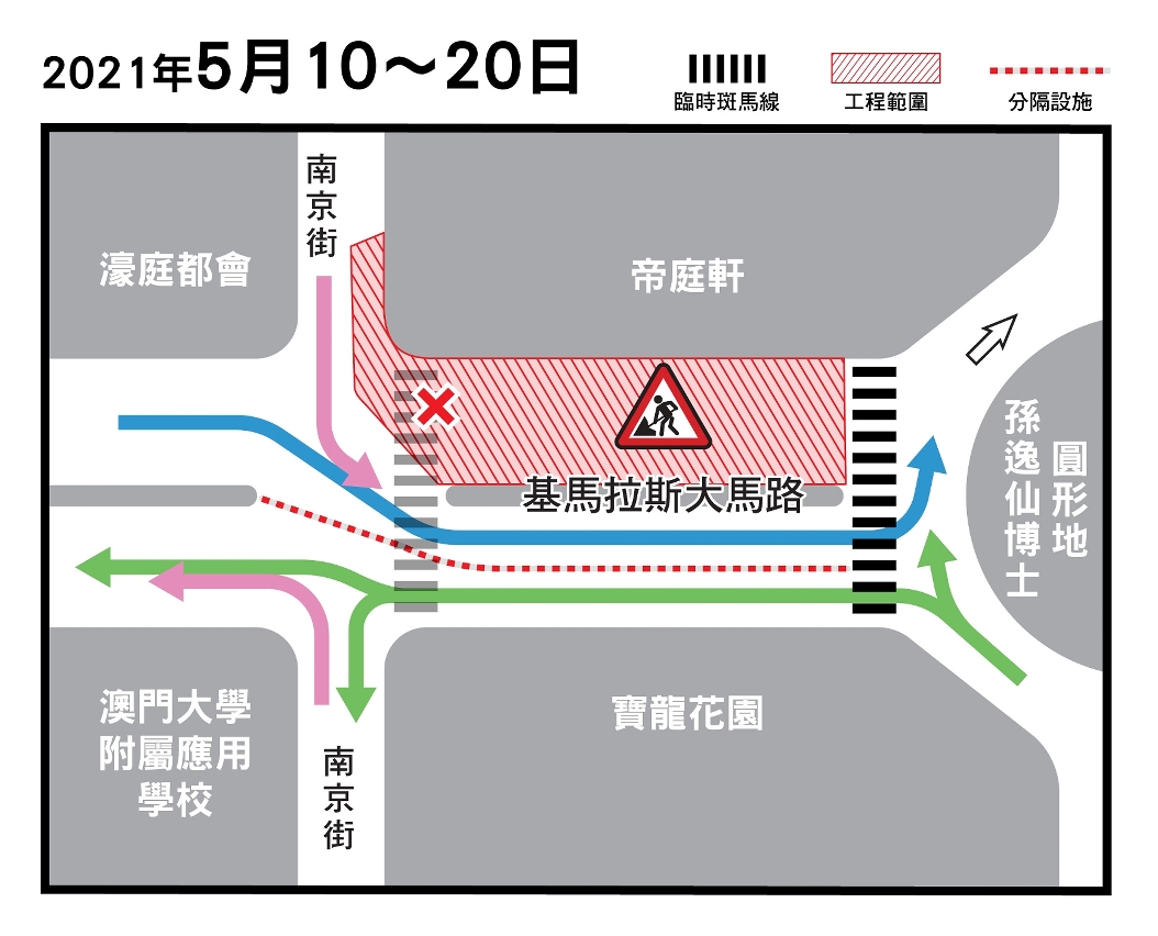配合基马拉斯大马路重铺路面工程,5月9日起,基马拉斯大马路与哥英布拉街交界禁止车辆通行;5月10日起,南京街与孙逸仙博士圆地之间靠帝庭轩一侧的基马拉斯大马路封闭交通,靠宝龙花园一侧实施临时双向行车,南京街近帝庭轩的路段改为单一方向行车,车辆只能往基马拉斯大马路方向行驶。
