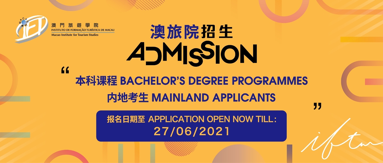 6月27日截止报名,合资格考生可于澳门旅游学院官网报名。欢迎致电8598-1495或电邮 admission@iftm.edu.mo 与教务部查询。