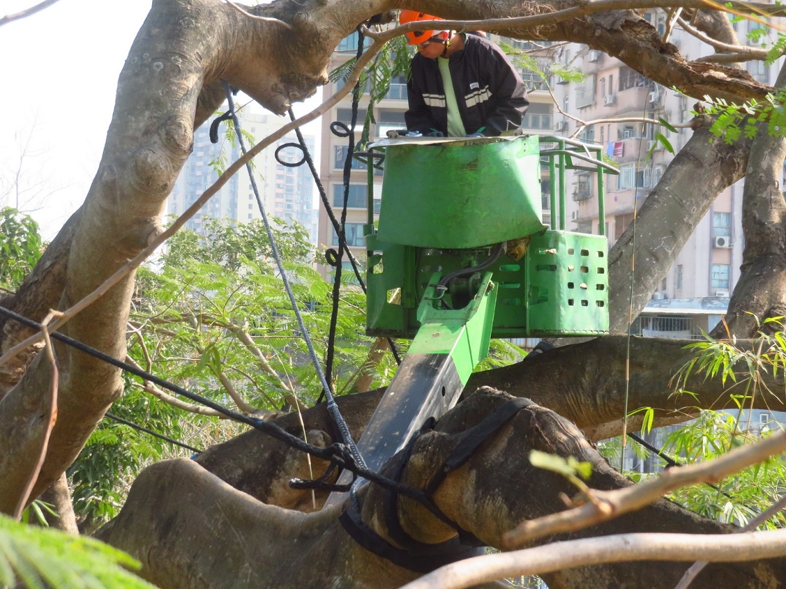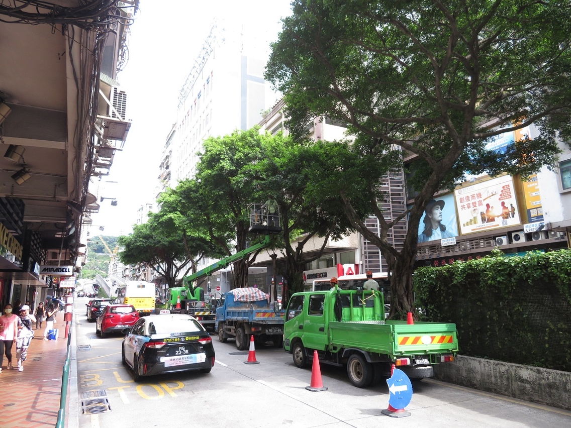为更好地安排风季前的树木修剪工作,市政署与交通事务局及治安警察局密切沟通,协调路况以方便人员修剪树木,有序安排风季前优先疏剪主干道路树的树冠及护理结构差、长势弱的树木。至五月,市政署人员已检查行道树及绿化带约14,000株、公园及公园内路旁斜坡约11,000株树木,修剪超过5,000多株行道树,移除100多株于城巿及路边有安全隐患的树木;于公园有39株树木因枯萎或感染褐根病而须移除,176株因结构存在危险缺陷及对公众构成风险而须要修剪,亦完成超过300株树木风季前预防折枝或倒塌的修剪工作。另外,为倾斜角度大而有倒塌风险的树木建造、调整及更换大型金属支撑架,涉及10株于公园的大树及10株古树。