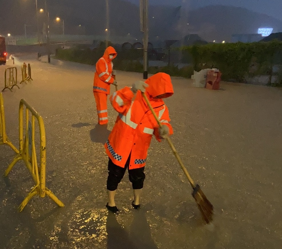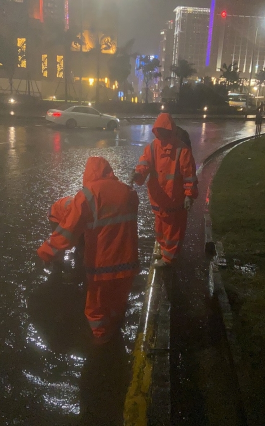 气象局于当日凌晨近3时发出黄色暴雨警告,市政署紧急应变小组已戒备及驻守部分泵站;大暴雨持续至凌晨5时,气象局更发出黑色暴雨警告,多个低洼地区均出现水浸情况,小组人员持续在全澳各区开展巡查和疏通渠道工作,重点关注水浸地区的排水情况,清理路边雨水井及打开渠盖,保持排水畅通;并持续监察多个雨水泵房,确保各泵房运作正常。待雨势稍减,水浸亦于短时间内退却。