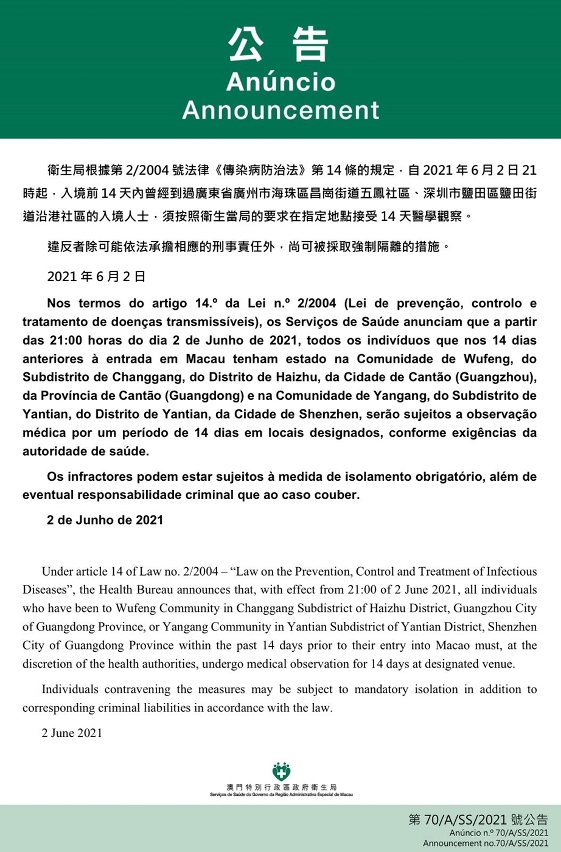 新型冠状病毒感染应变协调中心宣布,因应广东省广州市和深圳市的疫情变化,卫生局根据第2/2004 号法律《传染病防治法》第14 条的规定,自 2021年6月2日21时起,所有在入境前14天内曾经到过广东省广州市的海珠区昌岗街道五凤社区、深圳市盐田区盐田街道沿港社区的入境人士,须按照卫生当局的要求在指定地点接受14 天医学观察,违反者除可能依法承担相应的刑事责任外,尚可被采取强制隔离的措施。