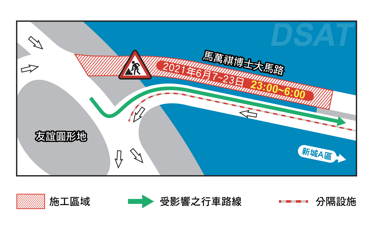 配合友谊圆形地行车天桥建造工程的天桥钢箱梁吊装工作,6月7日(周一)至23日(三)每晚11时至翌日上午6时马万祺博士大马路实施临时交通安排,详情参阅附表。其间101X及102X路线巴士会在警员指挥下行驶,原线停靠之巴士站维持不变。