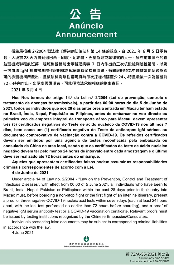 新型冠状病毒感染应变协调中心宣布,因应以下地区的疫情变化,卫生局根据2/2004号法律《传染病防治法》第14条的规定,自2021年6月5日零时起,入境前28天内曾到过巴西、印度、尼泊尔、巴基斯坦或菲律宾的人士,须在前来澳门的直航班机或联程航班第一程班机登机前出示新冠病毒7日内每次间相隔至少24小时的三次核酸检测阴性证明,以及一次血清IgM抗体检测阴性证明或新冠病毒疫苗接种凭证。有关证明须为中国驻当地使领馆认可的检测机构所发出,且核酸检测阴性证明须为每次采样相隔至少24小时且最后一次为登机前72小时内作出。出示虚假证明者,可能须依法承担相应的刑事责任。