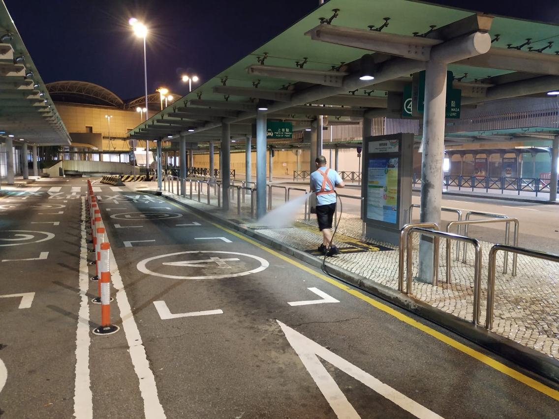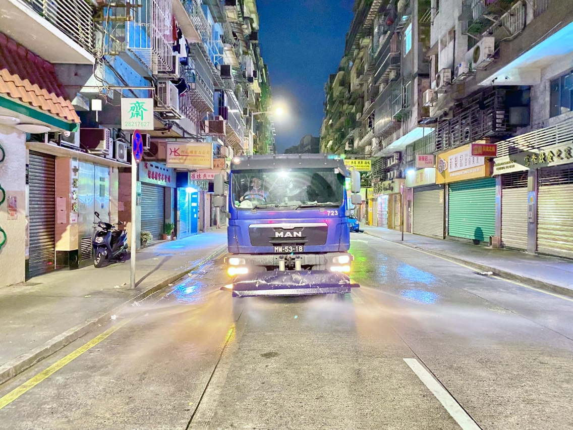 因应新型冠状病毒肺炎疫情发展,市政署持续协调外判公司在本澳各区以稀释漂白水清洗街道、出入境口岸等公共区域,并且加强巴士站候车亭、公厕、公共渠口、行人道扶手及栏杆等公共设施的清洁消毒工作,减低病毒散播风险。