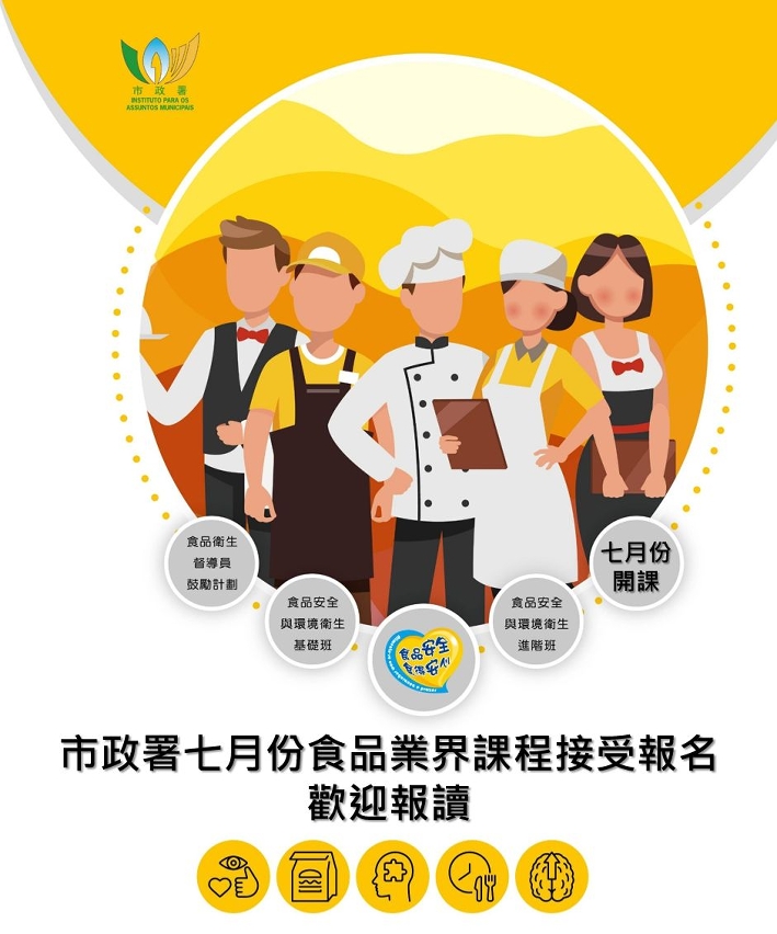 市政署一直致力推动食品安全教育与培训工作,持续为业界开办培训课程,以提升食安认知及操作水平。7月份食品卫生督导员课程、食品安全与环境卫生基础班及进阶班课程现正接受报名,费用全免,欢迎业界人士踊跃报读。