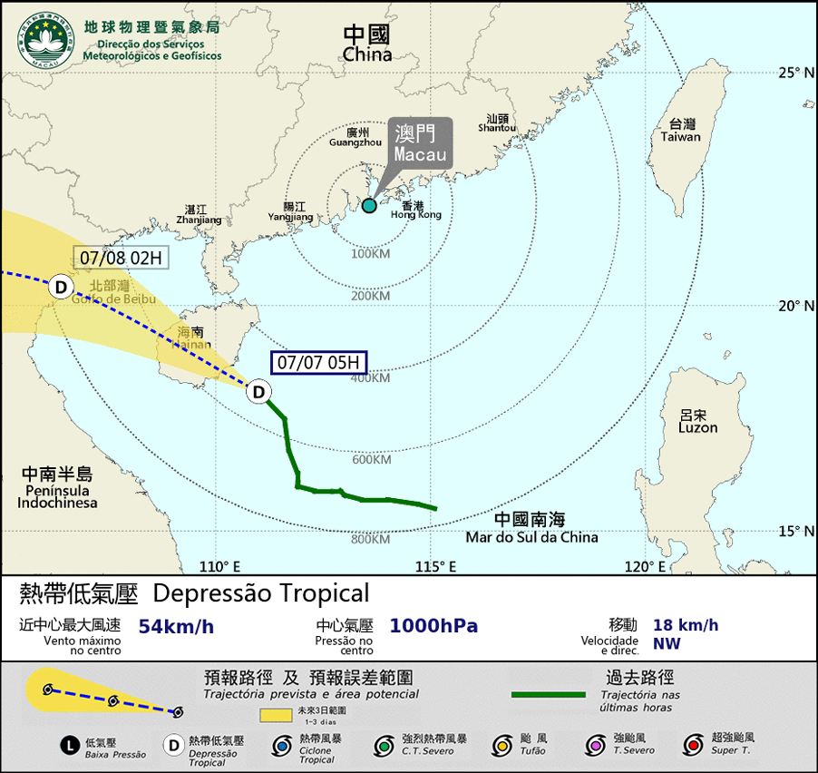 位于海南岛以南的热带低气压将于今日早上移向海南岛。由于该热带低气压与本澳保持一定距离,今日日间需要改发三号风球的机会偏低。同时,由于近日非天文大潮,本澳出现风暴潮水浸机会不大。