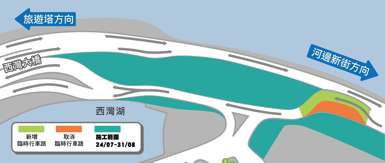 配合建设发展办公室进行妈阁交通枢纽的接渠街渠及管道铺设工程,以及后续需进行路面恢复工程,7月24日(周六)至8月31日(周二)西湾湖景大马路近轻轨妈阁站的双向车道实施有限度通车。交通事务局呼吁驾驶者遵守现场交通警员的指挥及安排。