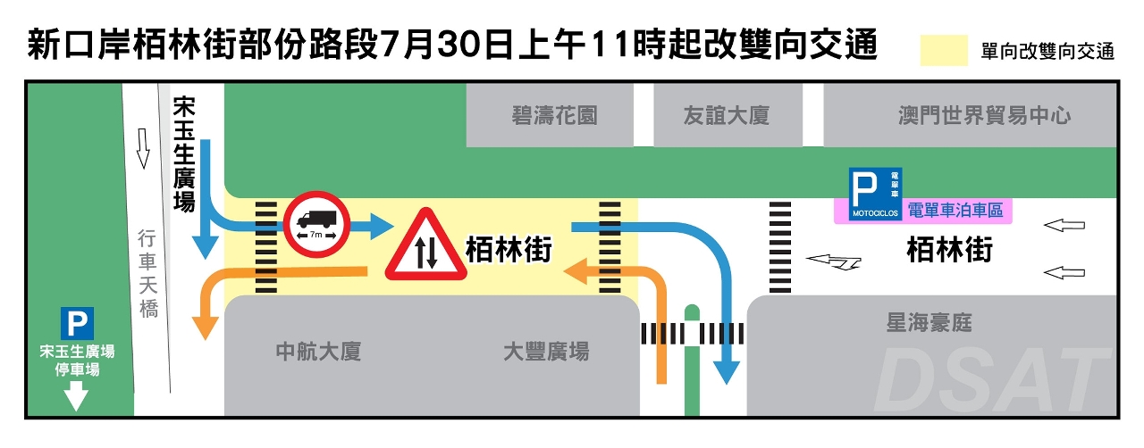 交通事务局现正于新口岸分阶段进行交通整治工程,当中栢林街的工程将会竣工。7月30日(周五)上午11时起,宋玉生广场与马时济总督大马路之间的一段栢林街会由原来的单向行车调整为双向行车,同时禁止长度超过7米之车辆由宋玉生广场转入栢林街。