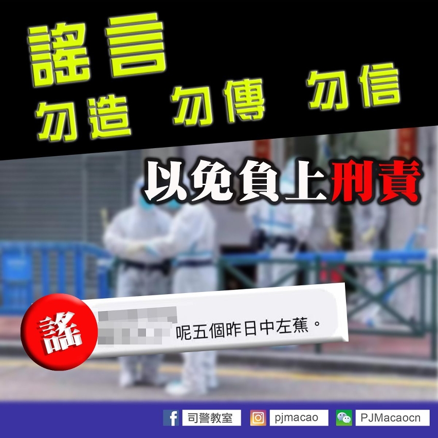 司警局在此呼吁,在突发公共事件下,尤其即时预防或更高级别的状态维持期间,意图引起公众受惊或不安,编造并传播有关的虚假资讯,行为人需负刑事责任,严重更可处最高三年徒刑。同时,呼吁市民应密切留意官方讯息,切勿轻信谣言。
