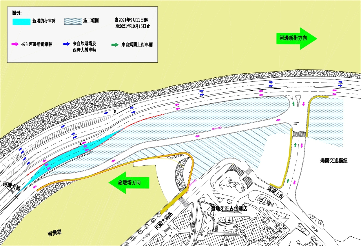 - 8月28日至9月10日:因取消由妈阁上街及民国大马路往返西湾湖景大马路的三岔口位置,车辆须改由妈阁交通枢纽的行车路往返西湾湖景大马路;(见图一)