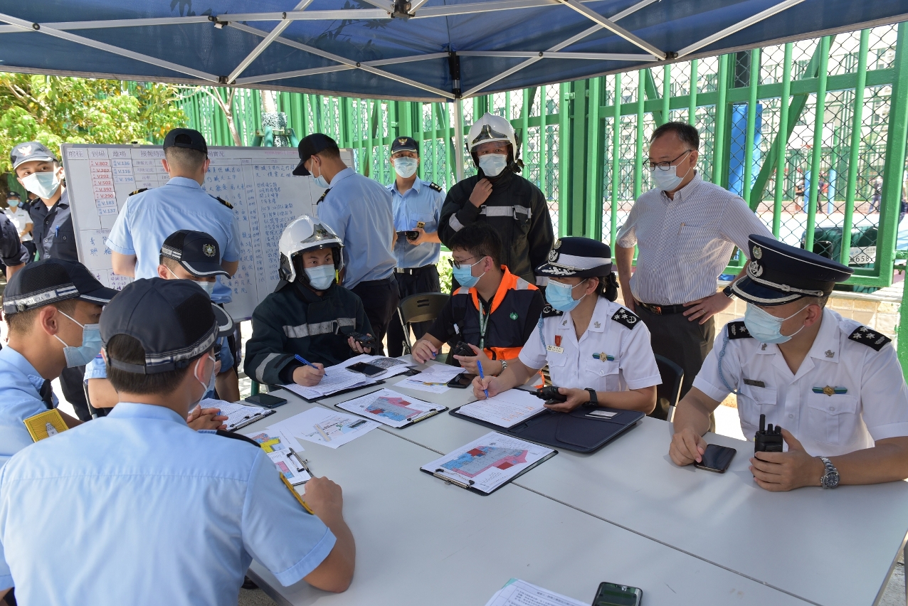 演习模拟在青茂口岸三楼的离境大厅靠近珠澳分界线位置,工作人员发现人工查验柜枱电脑突然起火冒烟,火势蔓延到三楼联检大堂内的其他查验柜枱及天花,工作人员按照既定的计划通报澳门消防局,并通知联检大楼内人员进行疏散,约80名人士疏散到大楼地面位置,当中有15名身体不适/受伤人士需要协助。