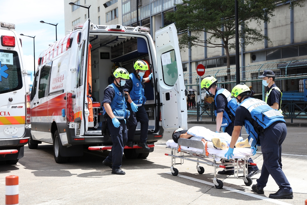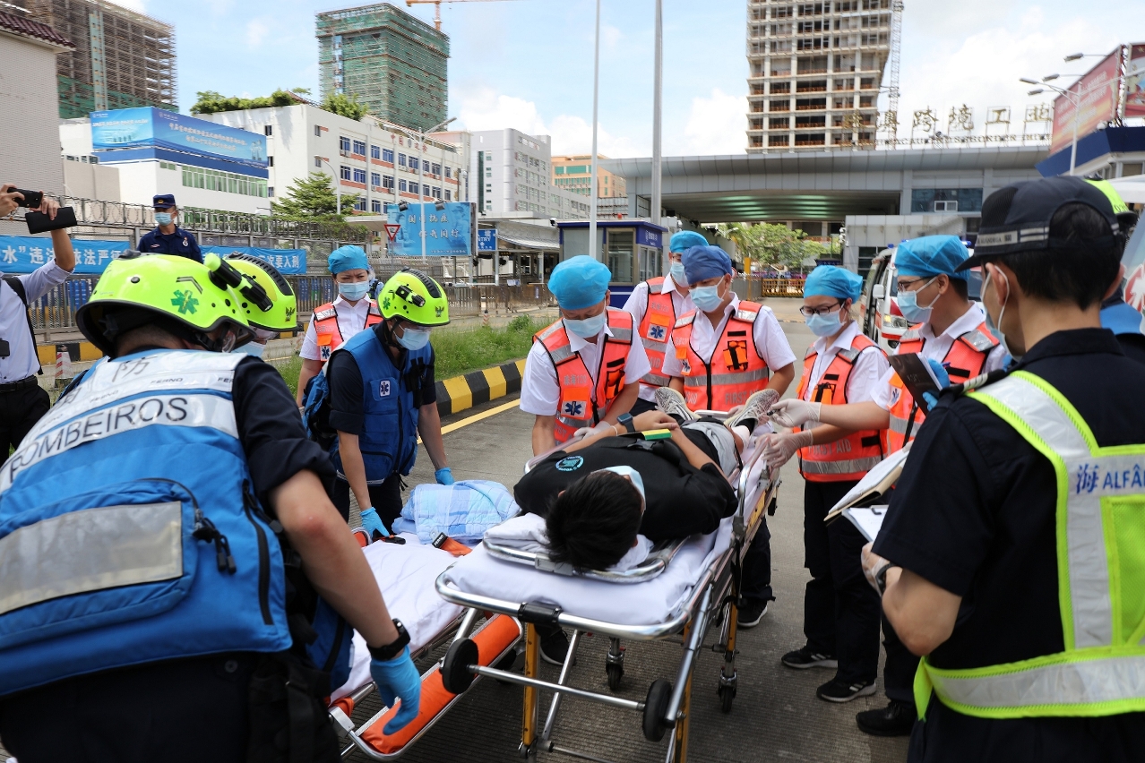 另外,在模拟火警发生时,青茂口岸珠方边检范围内有3名本澳居民因吸入浓烟感到身体不适,并要求回澳就医。因此,双方透过相关协调机制,由珠海市卫生健康局把3名澳门居民送到青洲跨境工业区出入境口岸位置,并交由澳门消防局救护车接载,模拟送往澳门仁伯爵综合医院治理。