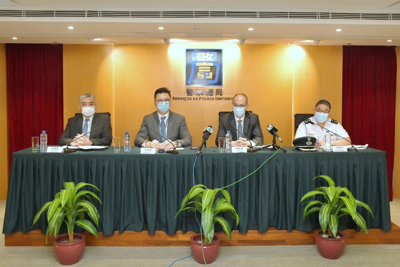 • 警察总局黄志康局长助理、司法警察局陈坚雄副局长、治安警察局梁庆康副局长及澳门海关布家明代厅长出席发布会,总结打撃成效。