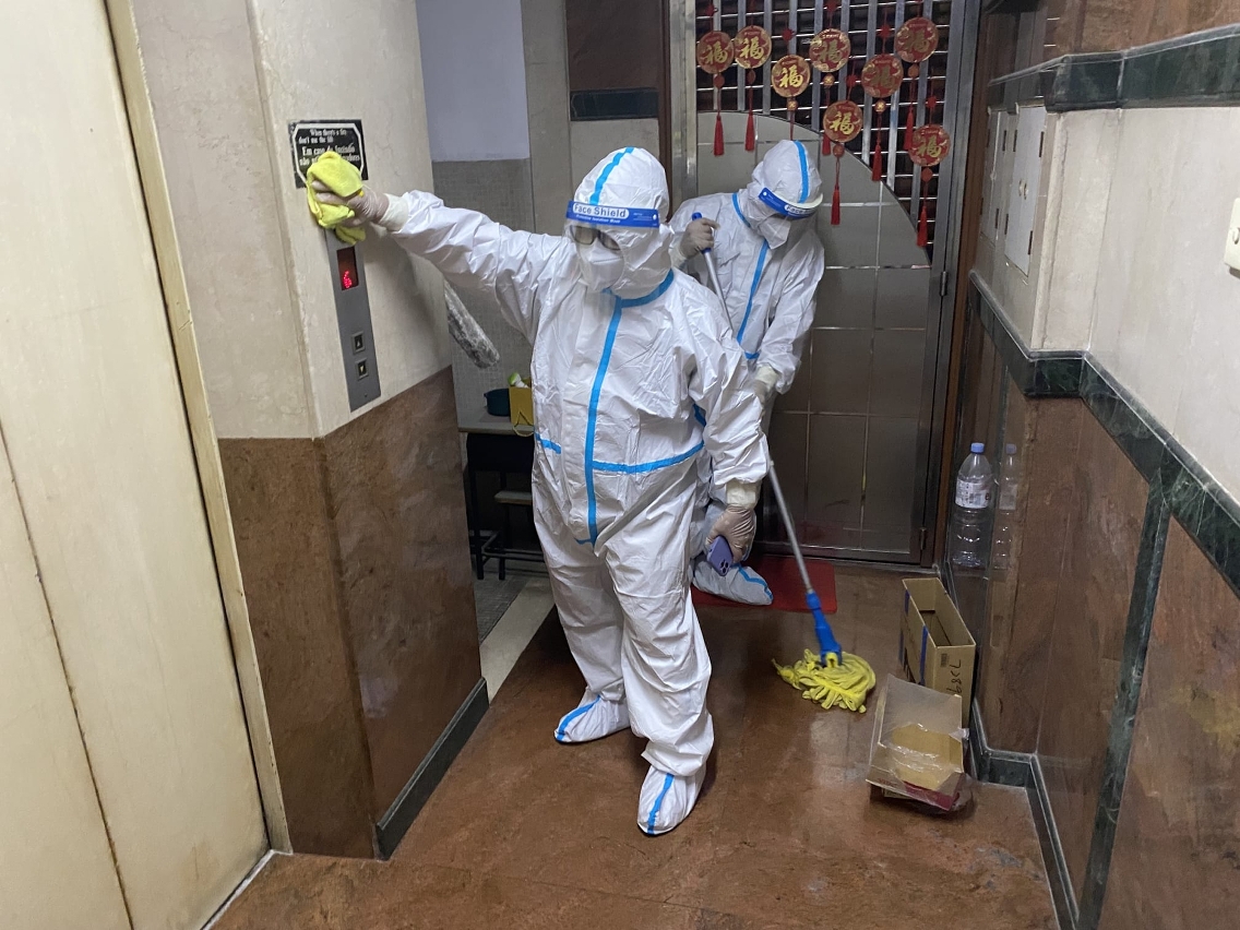 因应新型冠状病毒感染的最新情况并配合防控工作,市政署即时协调清洁专营公司及外判清洁加派人手,于10月4日对第72例确诊病例之工作地点周边街道、大厦公用部份等区域进行大型清洁及消毒工作,尽力减低传染病传播的条件。