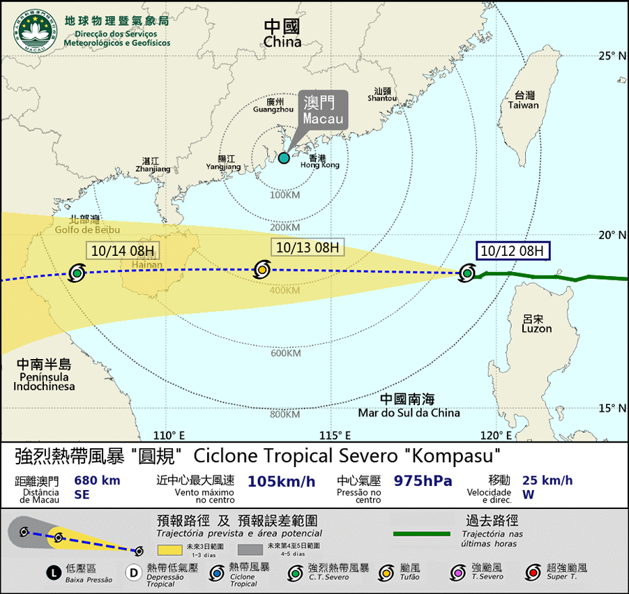 强烈热带风暴「圆规」正逐渐增强,预料今明两日将横过南海北部,明日(13日)凌晨至早上最接近澳门,在澳门以南约400公里范围内掠过,大致趋向海南岛。