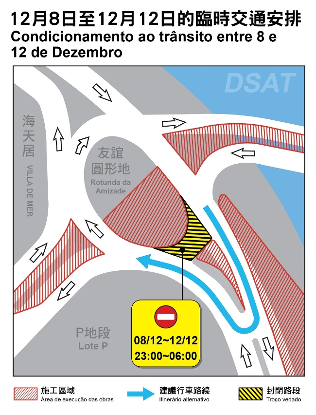 友谊圆形地近友谊桥大马路(往友谊大桥方向)的一段,则于12月8日(周三)至12月12日(周日)每日晚上11时至翌日上午6时封闭交通,由关闸往黑沙环方向的车辆需绕行友谊桥大马路的临时路口,并遵照现场交通警员安排行车。期间,101X及102X巴士路线改道行驶,但停靠站点不变。