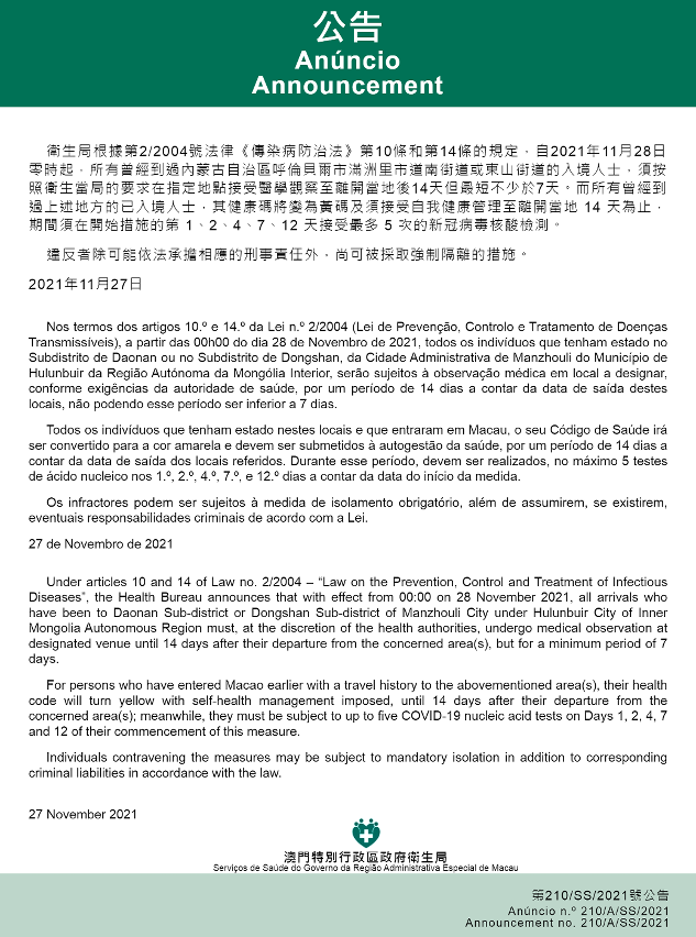 新型冠状病毒感染应变协调中心(下称“应变协调中心”)宣布,因应内蒙古自治区的疫情变化,卫生局根据第2/2004号法律《传染病防治法》第10条和第14条的规定,自2021年11月28日零时起,所有曾经到过内蒙古自治区呼伦贝尔市满洲里市道南街道或东山街道的入境人士,须按照卫生当局的要求在指定地点接受医学观察至离开当地后14天但最短不少于7天。而所有曾经到过上述地方的已入境人士,其健康码将变为黄码及须接受自我健康管理至离开当地 14 天为止,期间须在开始措施的第 1、2、4、7、12 天接受最多 5 次的新冠病毒核酸检测。免费核酸检测预约连结为https://app.ssm.gov.mo/mandatoryrnatestbook。核酸检测结果不会上载至澳门健康码亦不可作为出入境用途。如需将核酸检测结果在澳门健康码显示,则须自费检测。