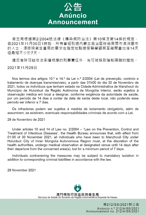 新型冠状病毒感染应变协调中心(下称“应变协调中心”)宣布,因应内蒙古自治区的疫情变化,卫生局根据第2/2004号法律《传染病防治法》第10条和第14条的规定,自2021年11月30日早上1时起,所有曾经到过内蒙古自治区呼伦贝尔市满洲里市的人士,须按照卫生当局的要求在指定地点接受医学观察至离开当地后14天但最短不少于7天。已入境人士,请立即透过咨询求助平台 https://www.ssm.gov.mo/covidq或致电28700800以便安排集中隔离医学观察。