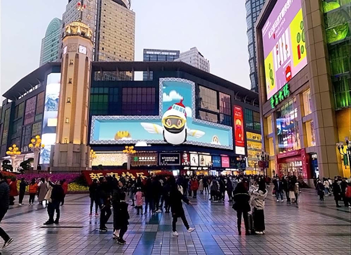 此外,解放碑广场商业大厦、解放碑广场金鹰财富中心及解放碑广场重庆百货大楼的外墙也有“旅游+”元素的广告视频,而重庆环球金融中心则有“安全宜游.魅力澳门”为主题的灯光幕墙广告。