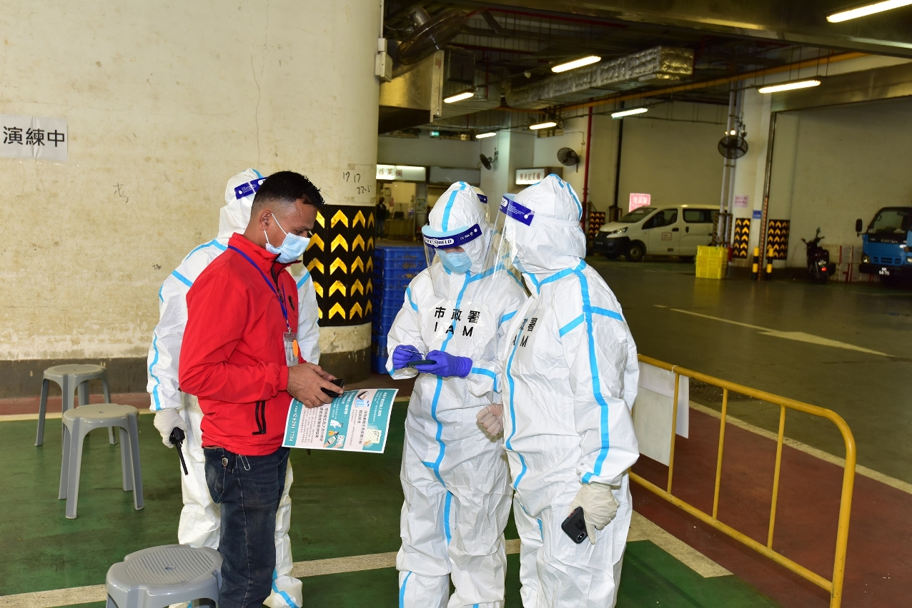 跨部门联合演习是模拟批发市场内有一工作人员确诊新冠肺炎,应变协调中心把场内涉事楼层划为防控区,即启动场内人员排查登记、提供维生支援、人员活动轨迹追踪、转送密切接触者隔离、迁移场内人员到医观酒店、抽取环境样本、安排场内人员进行核检、环境全面清洁消毒等连串防控工作。