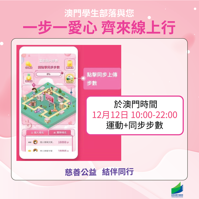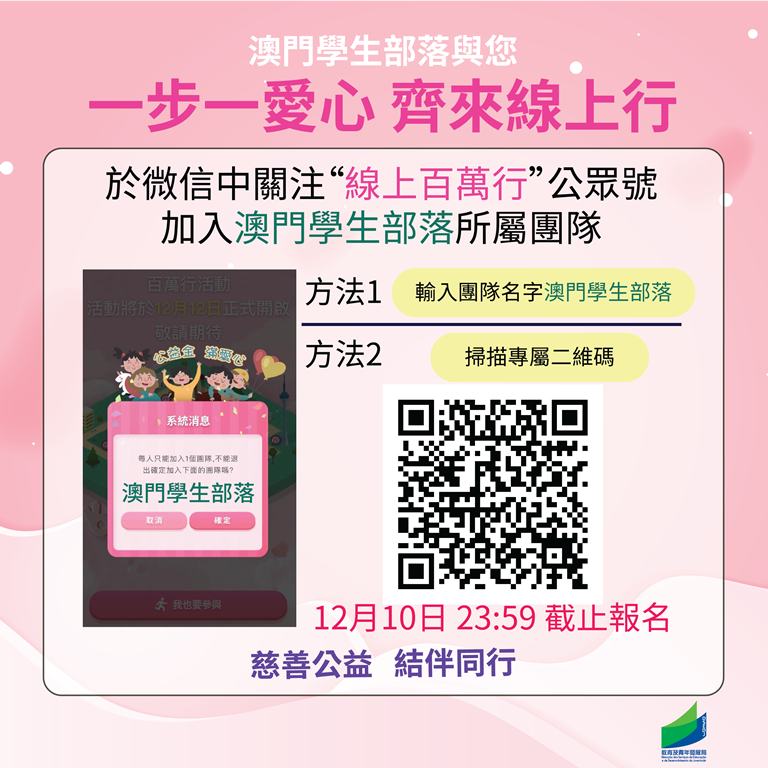 为了鼓励更多学生积极参与第三十八届公益金百万行,教育及青年发展局在澳门日报读者公益基金会的协助下,已于微信“线上百万行”微信公众号开通名为“澳门学生部落”的团队,欢迎在澳门或外地就读的澳门学生加入,捐赠“微信运动”所记录的步数,共襄善举。