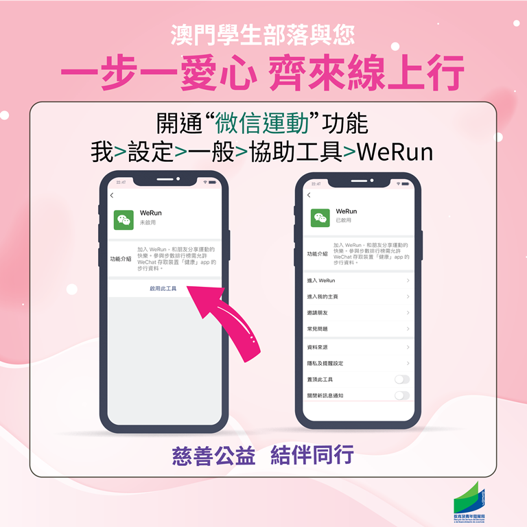 今年公益金百万行将于本周日(12日)以线上方式进行。有意参加的学生可由即日起至澳门时间12月10日晚上23时59分前透过以下两个步骤,便可在线上参与这项慈善盛事。首先,登入微信,关注“线上百万行”微信公众号,点击菜单“成团通道”,输入“澳门学生部落”团队名字获取二维码,并按指示加入团队,成功报名将获赠电子“起步证”。其后,已成功报名的人士,可于澳门时间12月12日早上10时至晚上22时期间,打开微信“设定”,拣选“一般”,点击“协助工具”,开启“微信运动(WeRun)”功能,步行及同步个人“微信运动”所记录的步数。