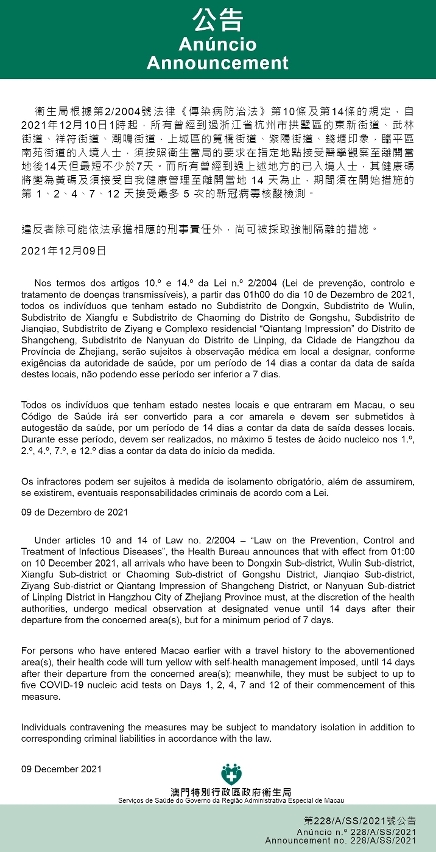 新型冠状病毒感染应变协调中心(下称“应变协调中心”)宣布,因应浙江省的疫情变化,自2021年12月10日1时起,所有曾经到过浙江省杭州市拱墅区东新街道、武林街道、祥符街道、潮鸣街道,上城区笕桥街道、紫阳街道、钱塘印象,临平区南苑街道的入境人士,须按照卫生当局的要求在指定地点接受医学观察至离开当地后14天但最短不少于7天。而所有曾经到过上述地方的已入境人士,其健康码将变为黄码及须接受自我健康管理至离开当地 14 天为止,期间须在开始措施的第 1、2、4、7、12 天接受最多 5 次的新冠病毒核酸检测。免费核酸检测预约连结为https://app.ssm.gov.mo/mandatoryrnatestbook。核酸检测结果不会上载至澳门健康码亦不可作为出入境用途。如需将核酸检测结果在澳门健康码显示,则须自费检测。
