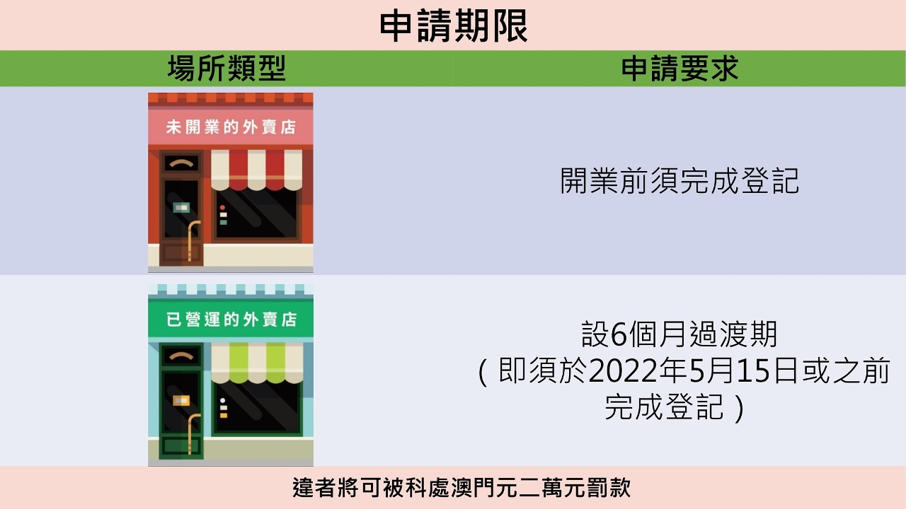 法规生效后,未开业的外卖店必须在获发登记证明后,才可向公众开放。至于在法规生效前已在财政局申报开业的外卖店,须于六个月过渡期内,即明年5月15日或之前完成登记,并获发登记证明。为便利营商、减低开业成本,市政署在确认提交的登记申请资料(如经营者资料和场所地址等)无误后,便会向场所发出登记证明。