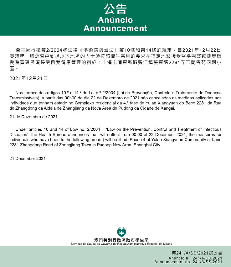另自2021年12月22日零时起,取消曾经到过以下地区的人士须按照卫生当局的要求在指定地点接受医学观察或健康码变为黄码及须接受自我健康管理的措施:上海市浦东新区张江镇张东路2281弄玉兰香苑四期小区。